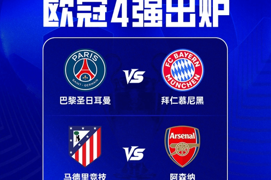 半决赛对阵随之敲定,巴黎将先主后客迎战拜仁,马竞则先主后客对决阿森纳,两回合角逐将于4月29日-30日及5月6日-7日凌晨展开,具体对阵如下: